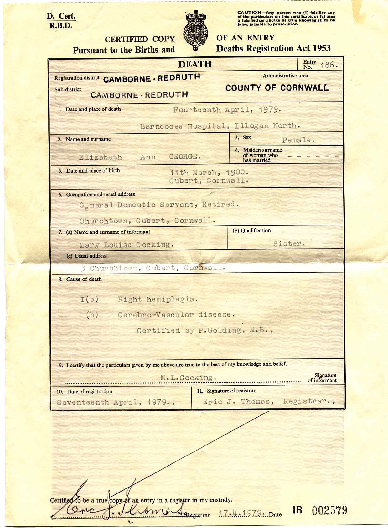 Elizabeth Anne GEORGE Birth: 11 March 1900 38 30 — Cubert, Cornwall Death: 14 April 1979 — Barncoose Hospital, Cornwall |