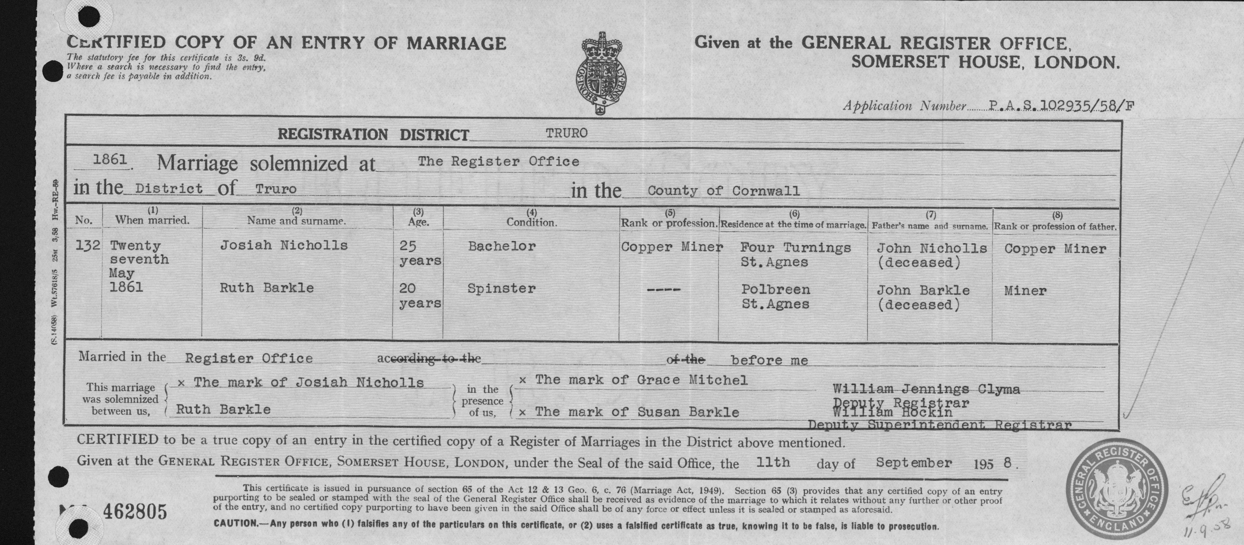 Marriage: 27 May 1861 — Truro Register Office |