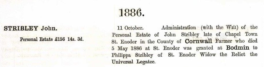 Administration (with the Will) of the Personal Estate of John Stribley late of Chapel Town St. Enoder in the County of Cornwall Farmer who died 5 May 1886 at St. Enoder was granted at Bodmin to Philippa Stribley of St. Enoder Widow the Relict the Universal Legatee |
